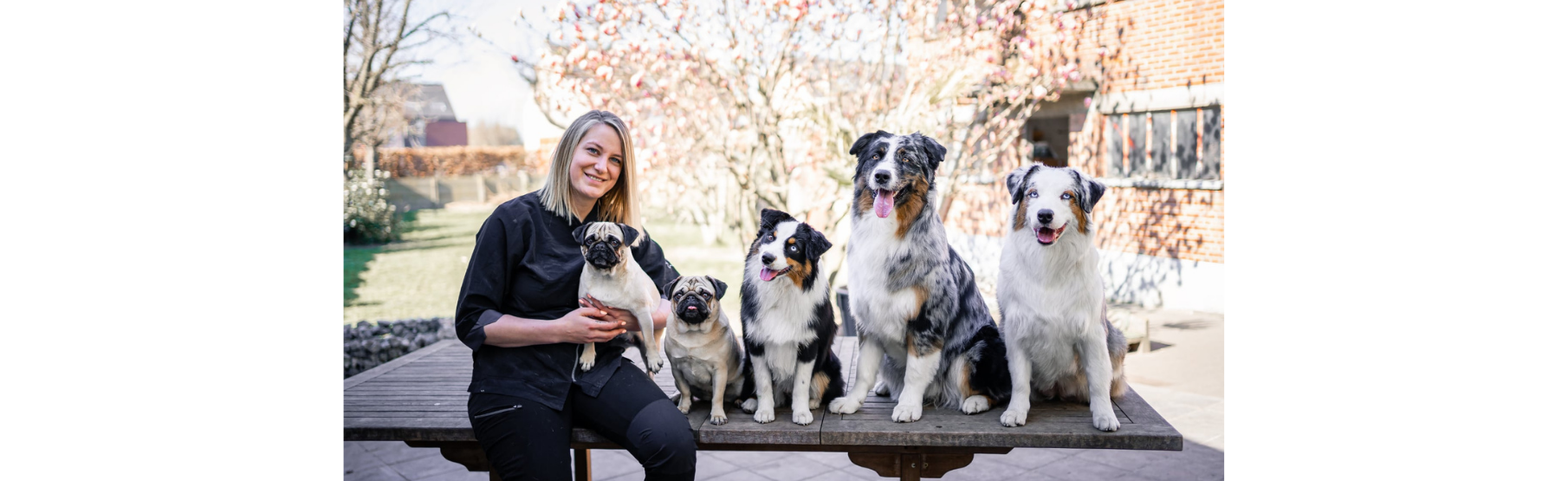 Thuis deel ik mijn leven met zes vrolijke honden: mopshondjes Fien en Fleur, drie Australische herders Tess, Tilly en Bibi, en mini-aussie Poppy. Zij herinneren me elke dag waarom ik doe wat ik doe: bijdragen aan een leven vol energie, balans en blijdschap voor elke hond.